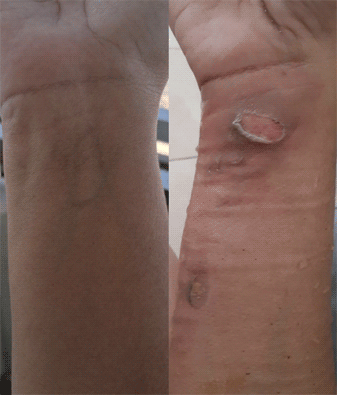 ביום שני, יום לאחר שהתחלתי למרוח את המוצרים, עדיין לא ניכר שינוי, אך יום לאחר מכן הכוויה הפכה למין פצע שמתחיל להגליד, וכבר ביום רביעי העור היבש מעל הפצע התקלף כמעט במלואו.